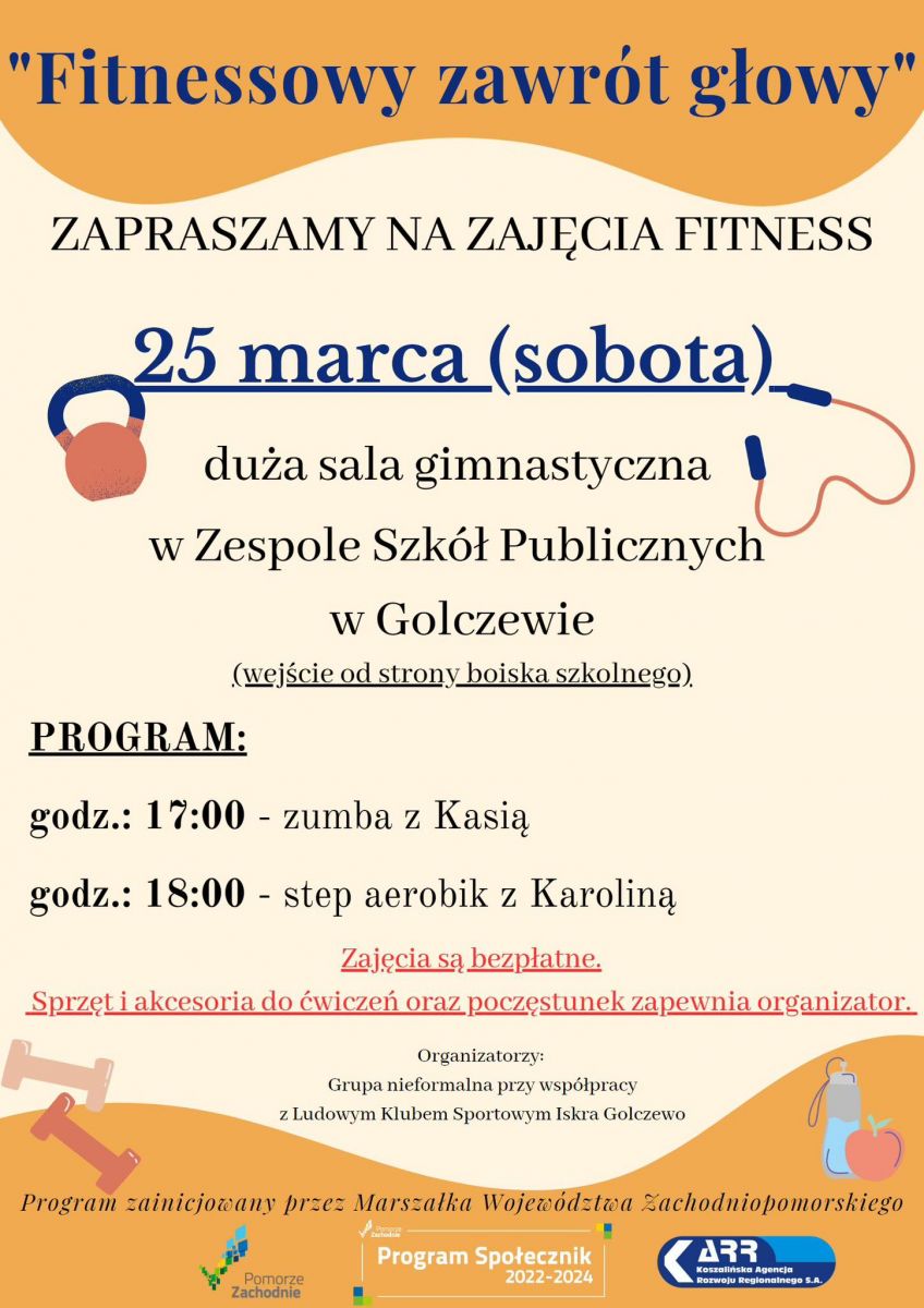 Już w kolejną sobotę (25.03) w dużej sali gimnastycznej Zespołu Szkół Publicznych w Golczewie odbędą się zajęcia fitness pn. „Fitnessowy zawrót głowy” w ramach realizacji projektu z Programu Społecznik na lata 2022 – 2024.