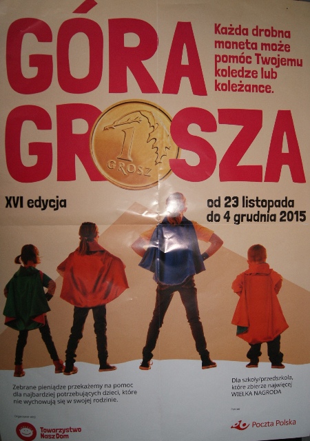 Rozpoczęliśmy akcję "Góra Grosza". Jest to już XVI edycja. Uczniowie pracujący w Samorządzie Uczniowskim klas IV-VI zbierają "grosze" na rzecz innych kolegów i koleżanek będących w potrzebie, którzy nie wychowują się w swoich rodzianch.