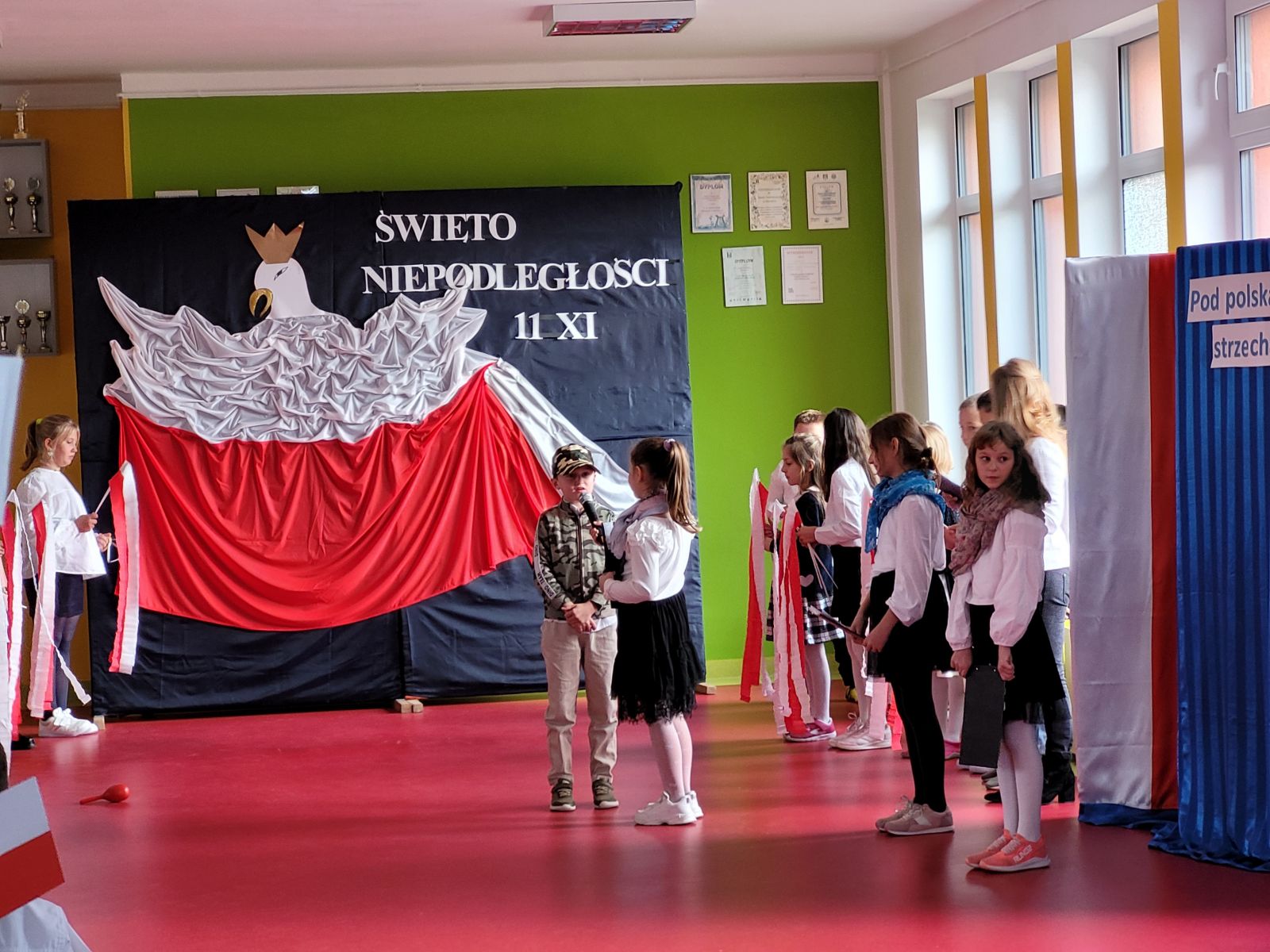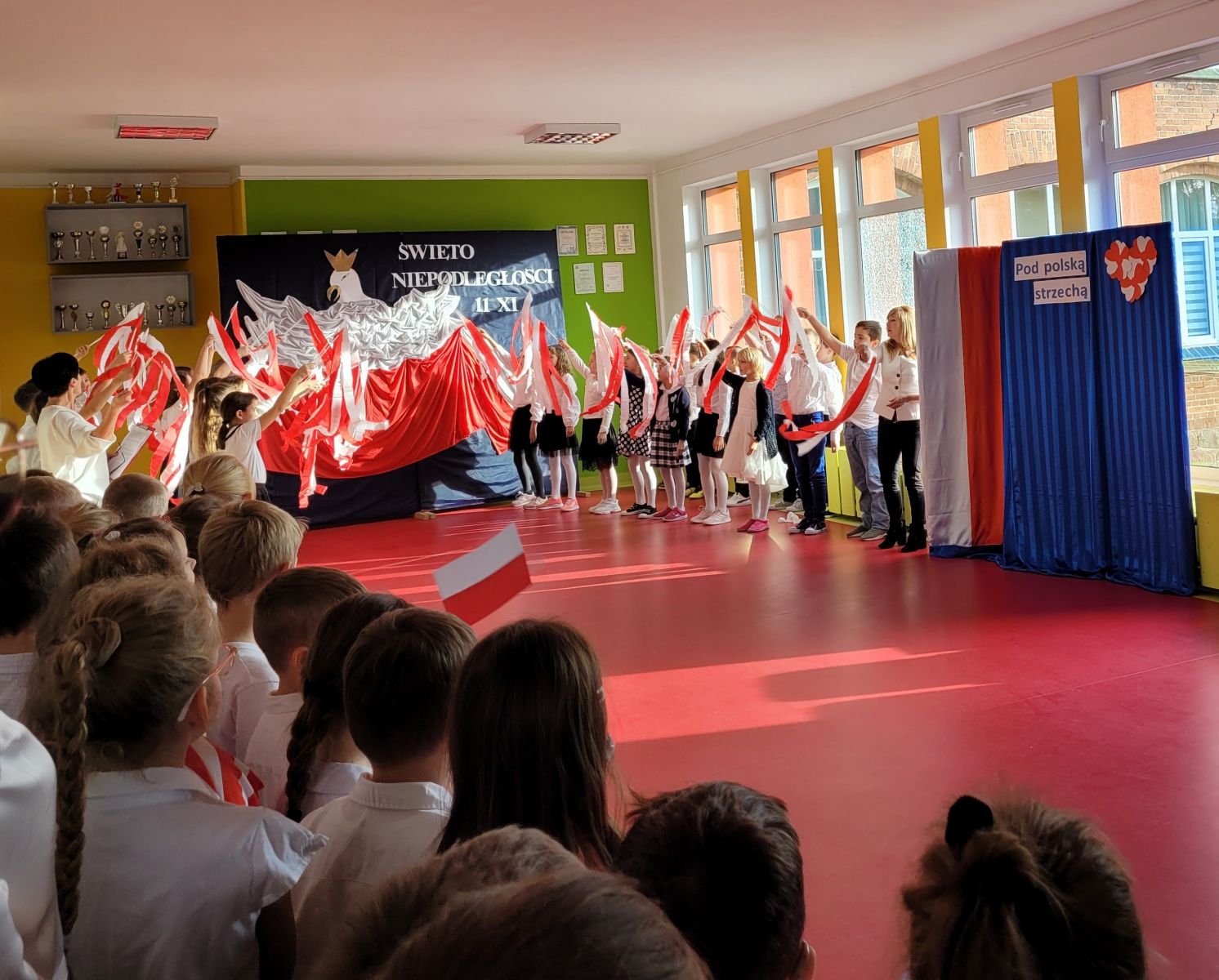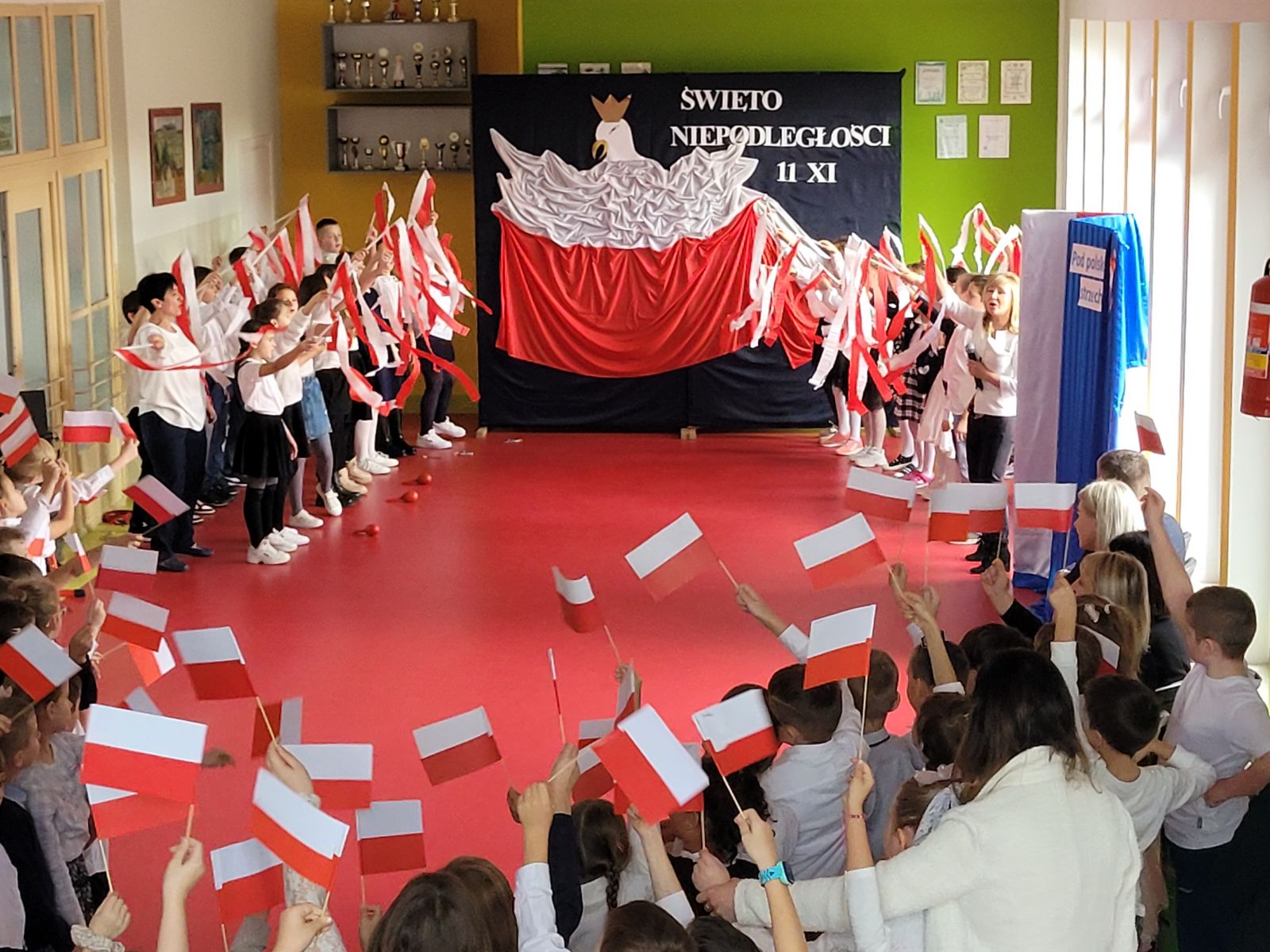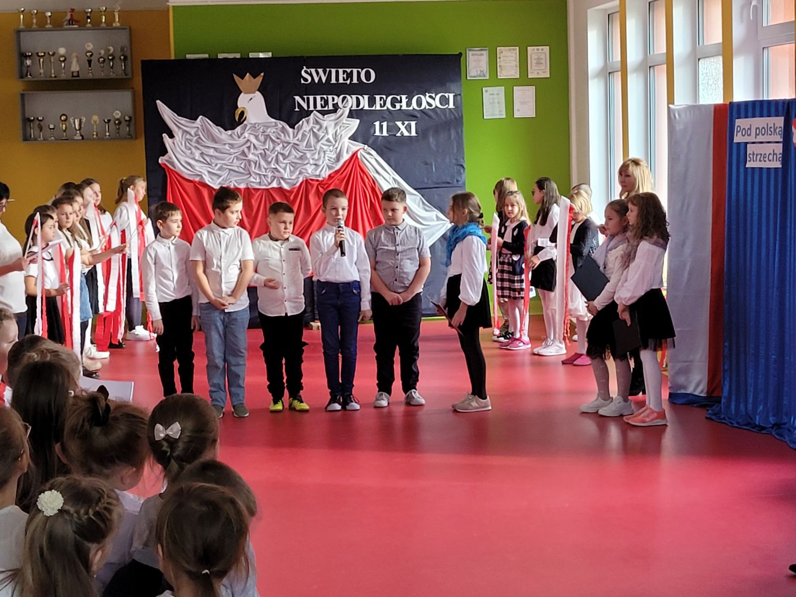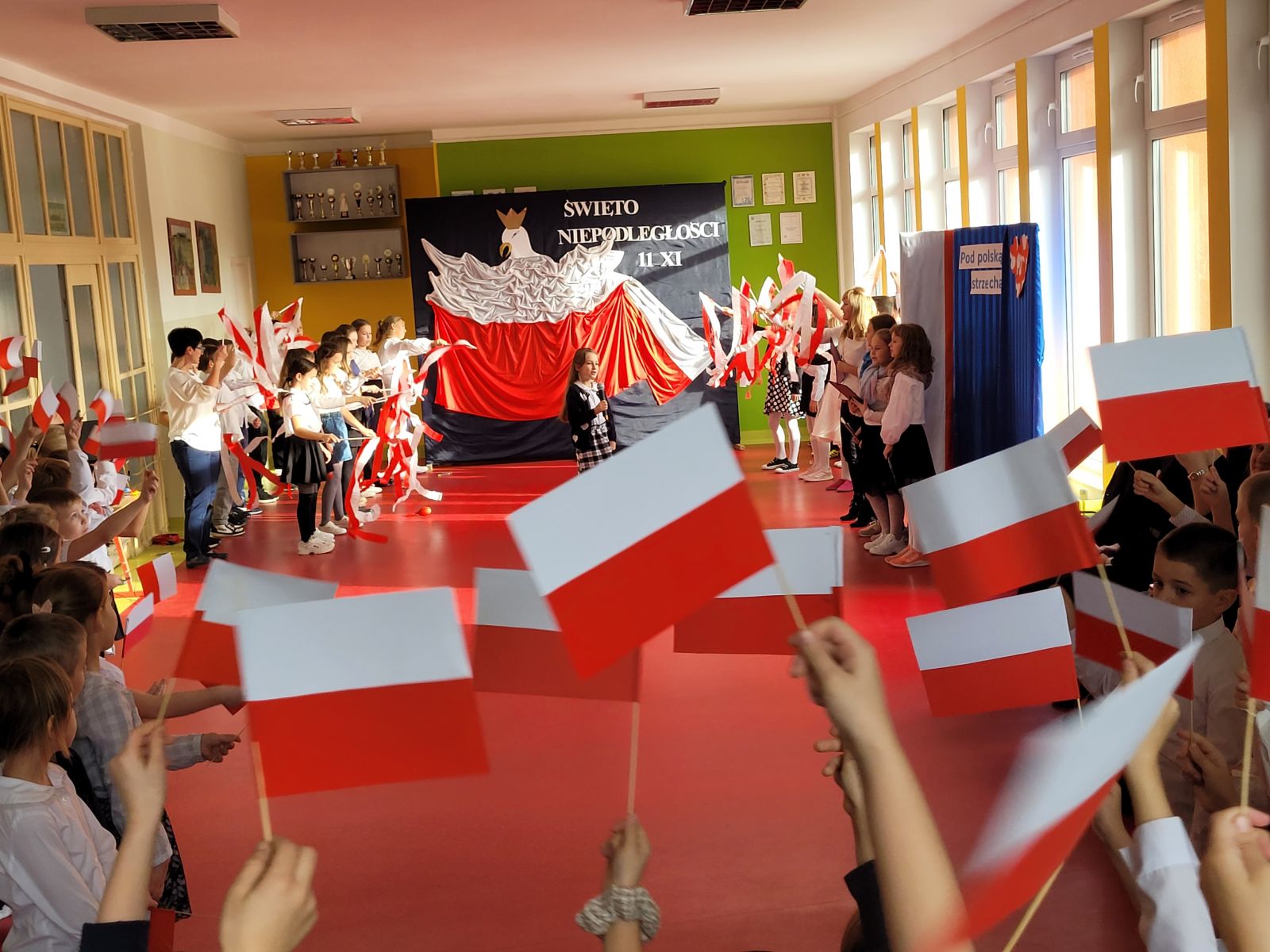 Z okazji Święta Niepodległości, 10 listopada 2023 roku uczniowie klasy 3a i 3b, wraz z wychowawczyniami – panią Renatą Baraniak i panią Bogumiłą Rudolf, zaprezentowali montaż słowno – muzyczny. W podniosły nastrój wprawiły słuchaczy patriotyczne pieśni, zaśpiewane przez uczniów. Motto przewodnie nawiązywało do tytułu piosenki: „Zachwyca nas Polska”. Dzieci pokazały, że słowo „ojczyzna” przez każdego może być rozumiane inaczej. Wcielając się w rolę dziennikarzy, miały okazję zapytać publiczność o to, czym jest dla nich Polska. Przedstawienie skłoniło do refleksji zarówno dzieci, jak i dorosłych. Pokazało, że Polska to nasz wspólny dom i powinniśmy mieć świadomość, jak bardzo jest dla nas ważna.