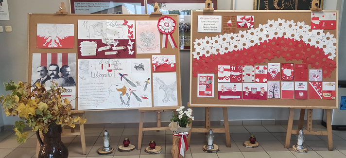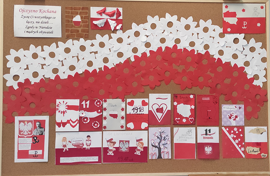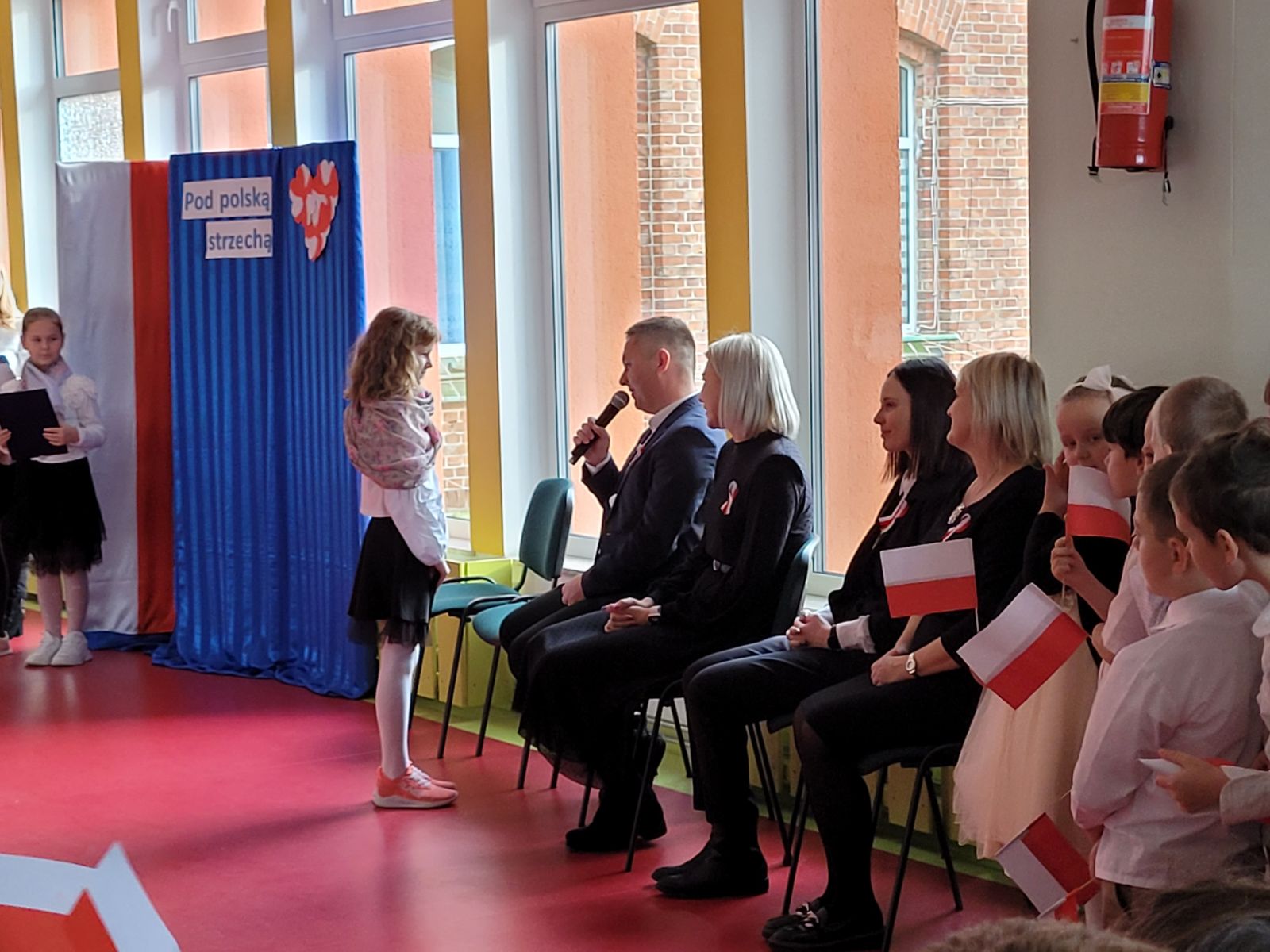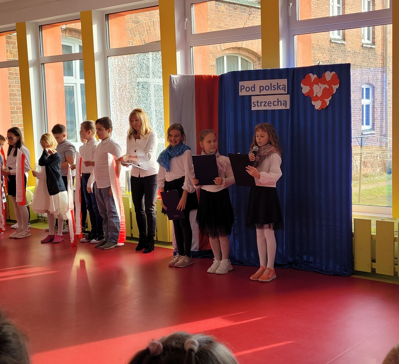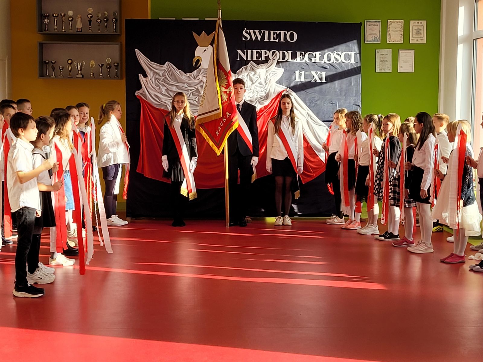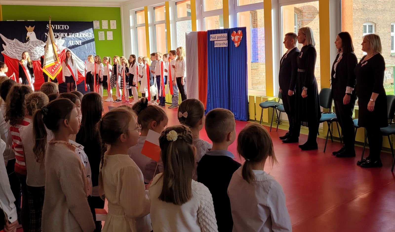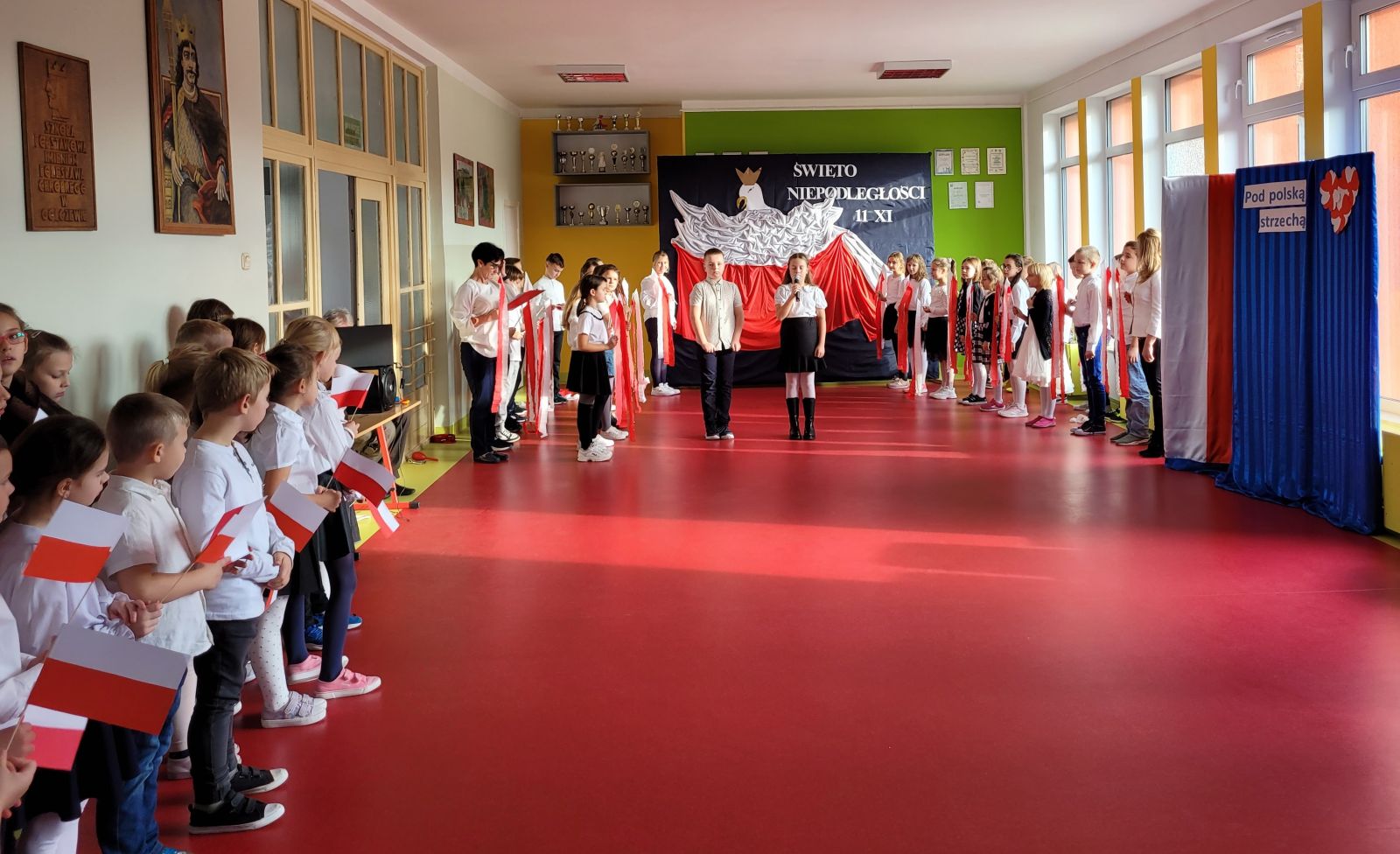 Z okazji Święta Niepodległości, 10 listopada 2023 roku uczniowie klasy 3a i 3b, wraz z wychowawczyniami – panią Renatą Baraniak i panią Bogumiłą Rudolf, zaprezentowali montaż słowno – muzyczny. W podniosły nastrój wprawiły słuchaczy patriotyczne pieśni, zaśpiewane przez uczniów. Motto przewodnie nawiązywało do tytułu piosenki: „Zachwyca nas Polska”. Dzieci pokazały, że słowo „ojczyzna” przez każdego może być rozumiane inaczej. Wcielając się w rolę dziennikarzy, miały okazję zapytać publiczność o to, czym jest dla nich Polska. Przedstawienie skłoniło do refleksji zarówno dzieci, jak i dorosłych. Pokazało, że Polska to nasz wspólny dom i powinniśmy mieć świadomość, jak bardzo jest dla nas ważna.