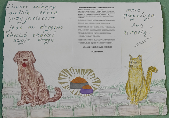 UCZNIOWIE KOŁA BIOLOGICZNO - EKOLOGICZNEGO PRAGNĄ ZWRÓCIĆ SIĘ DO WSZYSTKICH UCZNIÓW NASZEJ SZKOŁY PROSZĄC O POMOC W ZBIÓRCE KARMY DLA PSÓW I KOTÓW ZE SCHRONISKA W SOSNOWICACH ABY MOGŁY GODNIE PRZETRWAĆ OKRES ZIMOWY.