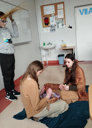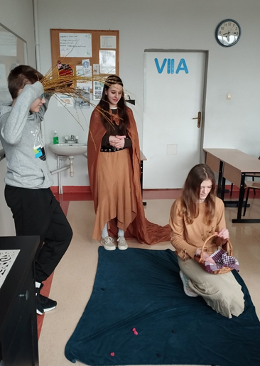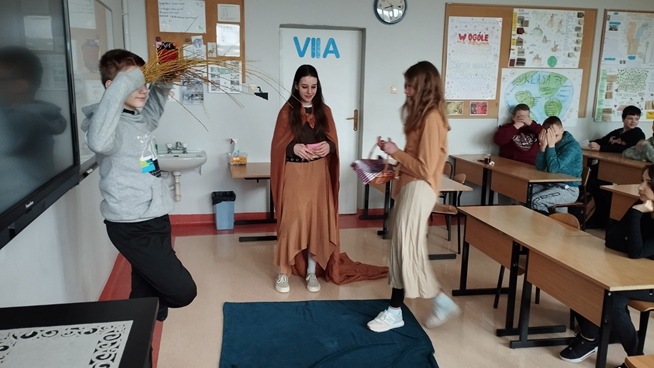 Ostatnio uczniowie klasy 7 A na lekcji języka polskiego próbowali swoich sił aktorskich. Podzieleni na kilkuosobowe zespoły wcielili się w bohaterów dramatu Juliusza Słowackiego pt. Balladyna. Przygotowali krótkie inscenizacje aktów omawianego tekstu. Na scenie pojawiły się m.in. takie postacie jak Balladyna, Alina, Wdowa, Kirkor, Chochlik, Skierka, Grabiec. Siódmoklasiści do zadania podeszli odpowiedzialnie: zadbali o stosowne stroje, przygotowali rekwizyty oraz scenografię.