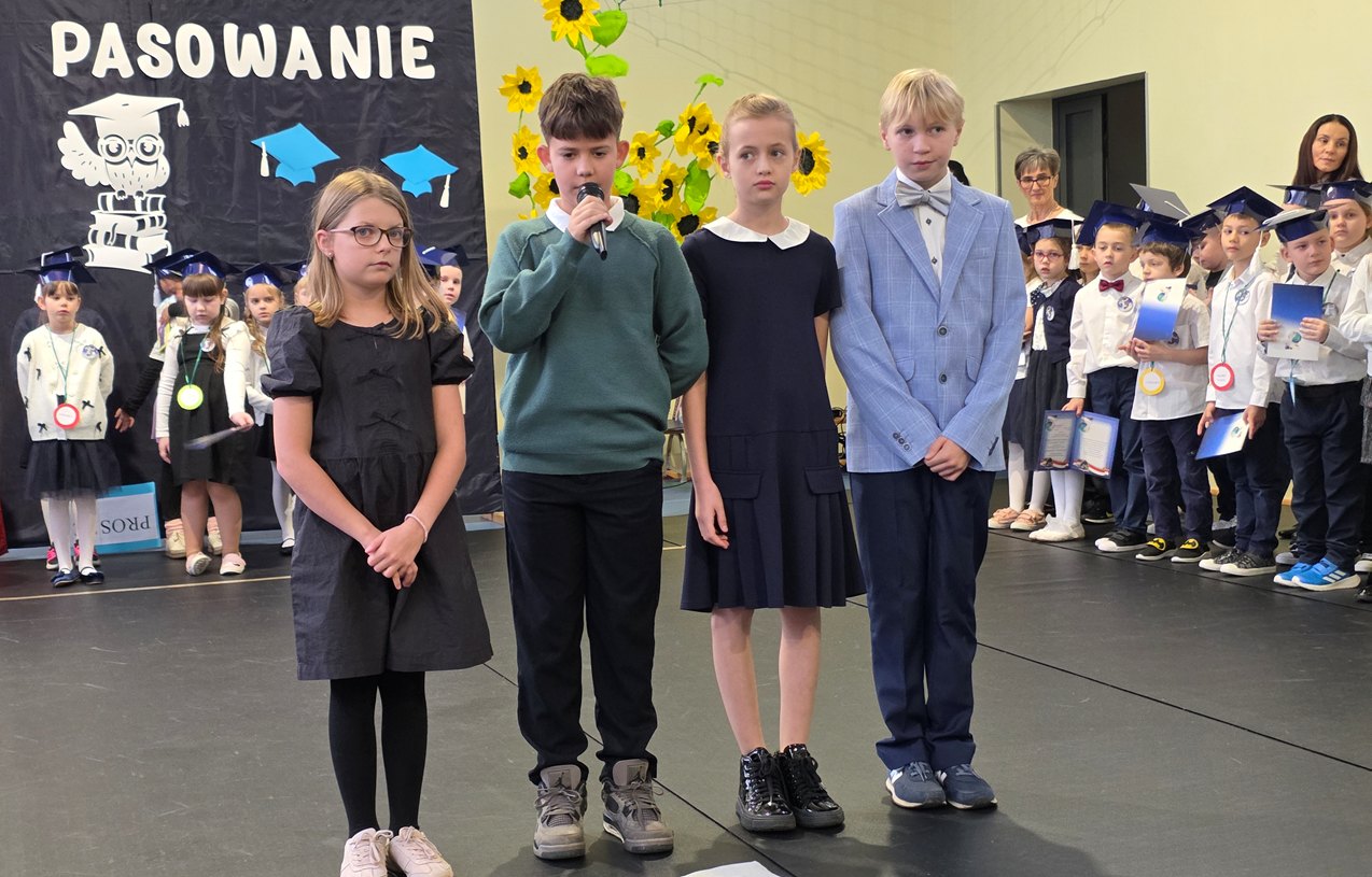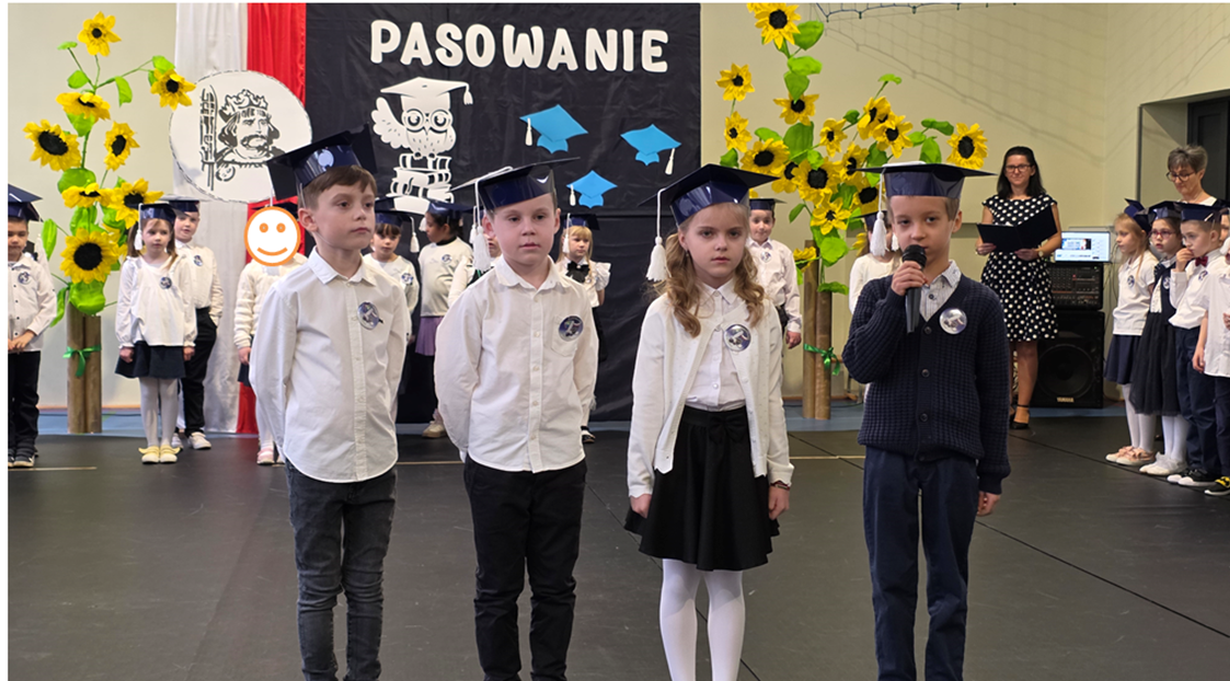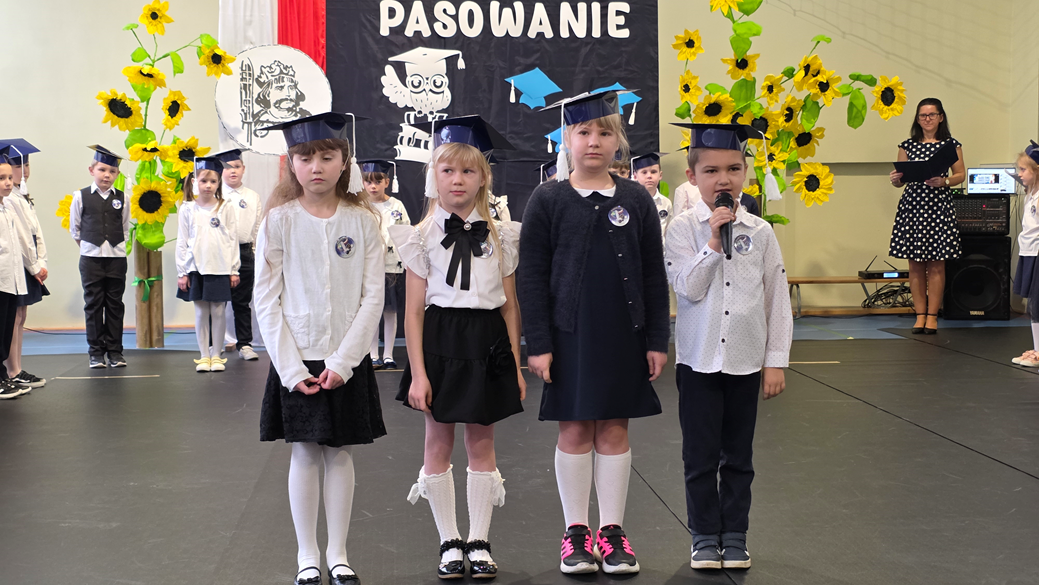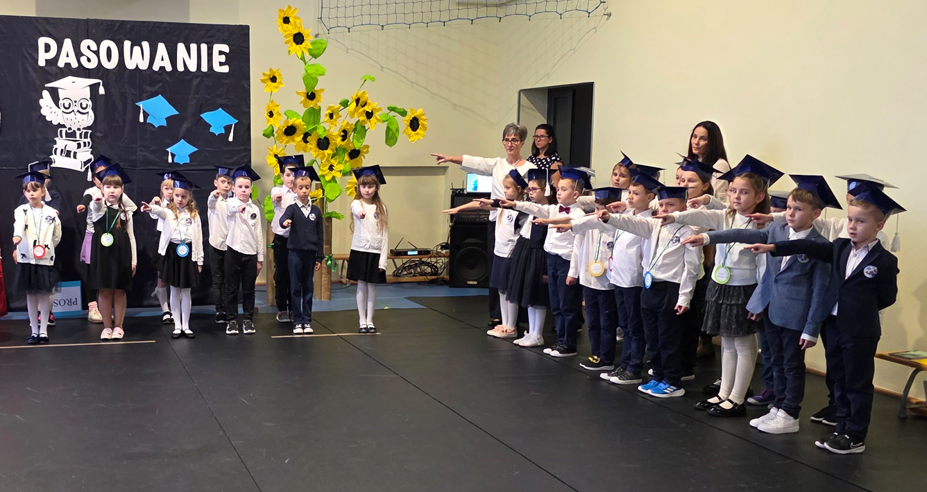 Uczniowie klasy pierwszej przedstawili program artystyczny, w którym zaprezentowali swoje umiejętności recytatorskie, wokalne i taneczne. Po prezentacji, pierwszoklasiści w pięknych biretach na głowach, w podniosłej atmosferze, przed pocztem sztandarowym, ślubowali być dobrymi Polakami, godnie reprezentować swoją szkołę, oraz swym zachowaniem i nauką sprawiać radość rodzicom i nauczycielom. Pani dyrektor, Monika Kiełbasa, dokonała symbolicznego aktu pasowania na ucznia. Od tej chwili stali się oni nowymi członkami naszej wielkiej szkolnej rodziny! Następnie wychowawczynie wręczyły uczniom pamiątkowe dyplomy. Uroczyste spotkanie zakończyło się wykonaniem pamiątkowych zdjęć.