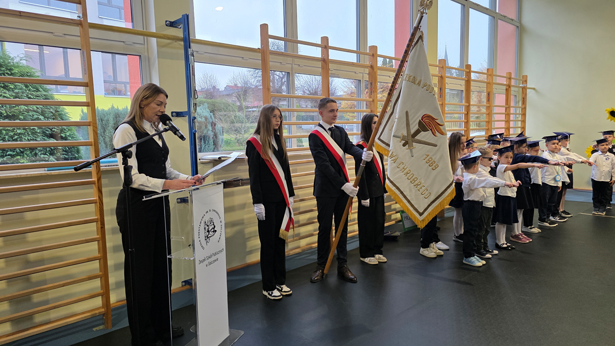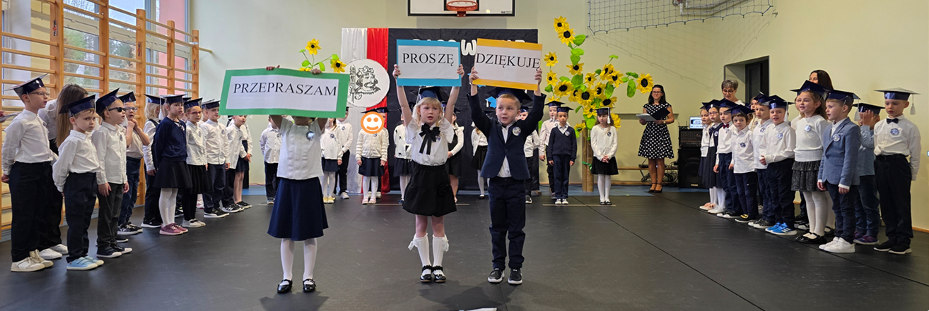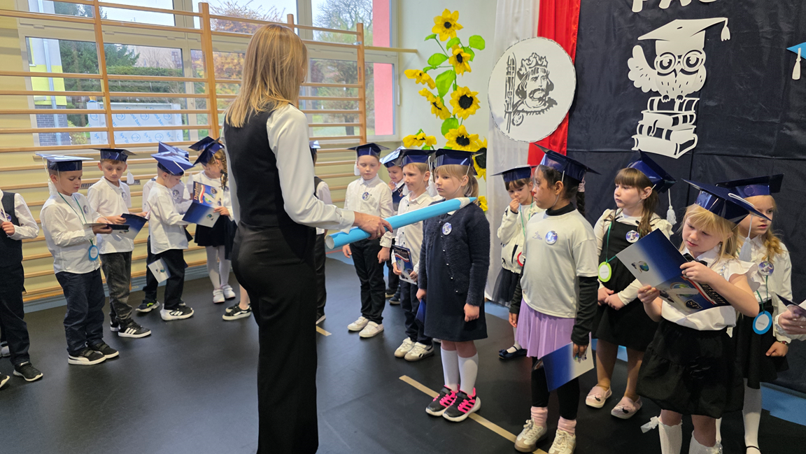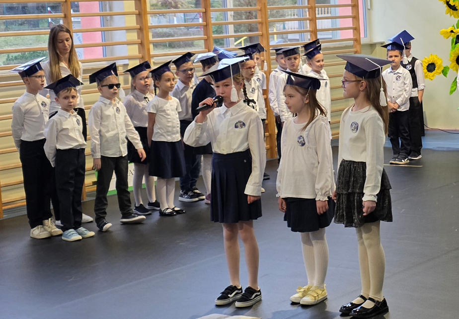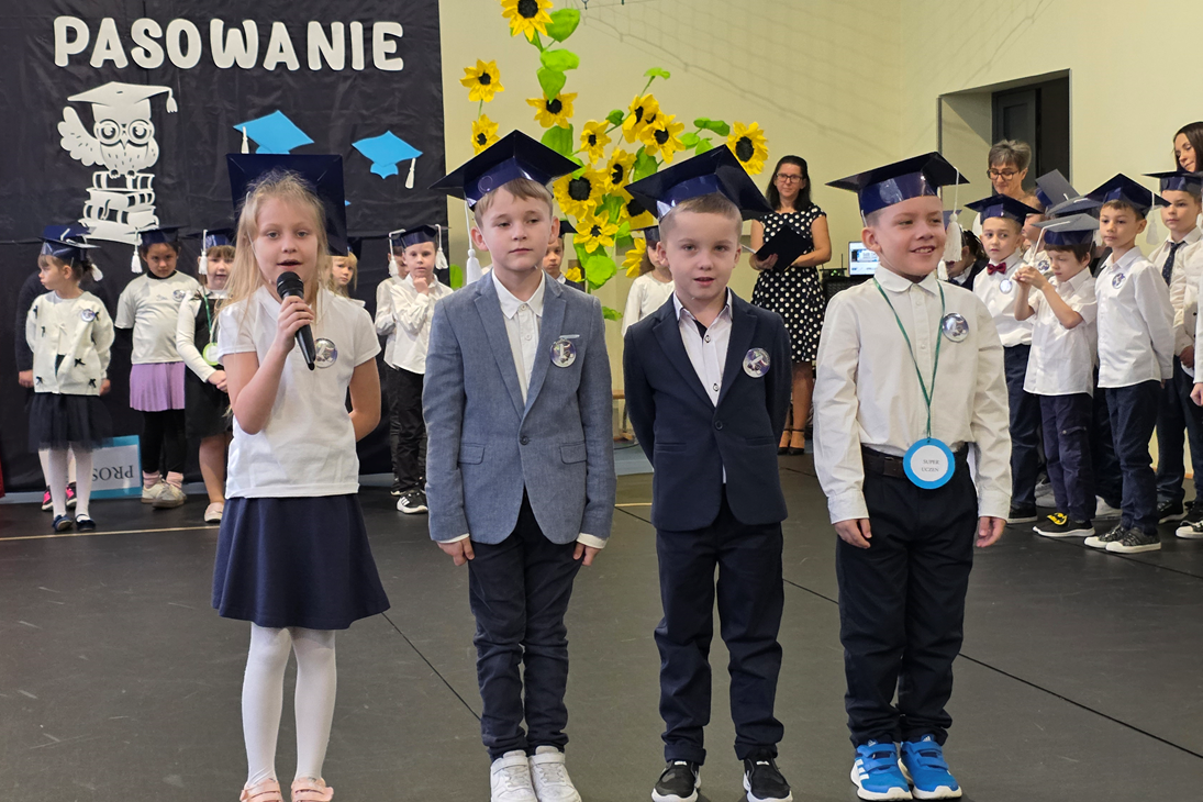 Uczniowie klasy pierwszej przedstawili program artystyczny, w którym zaprezentowali swoje umiejętności recytatorskie, wokalne i taneczne. Po prezentacji, pierwszoklasiści w pięknych biretach na głowach, w podniosłej atmosferze, przed pocztem sztandarowym, ślubowali być dobrymi Polakami, godnie reprezentować swoją szkołę, oraz swym zachowaniem i nauką sprawiać radość rodzicom i nauczycielom. Pani dyrektor, Monika Kiełbasa, dokonała symbolicznego aktu pasowania na ucznia. Od tej chwili stali się oni nowymi członkami naszej wielkiej szkolnej rodziny! Następnie wychowawczynie wręczyły uczniom pamiątkowe dyplomy. Uroczyste spotkanie zakończyło się wykonaniem pamiątkowych zdjęć.
