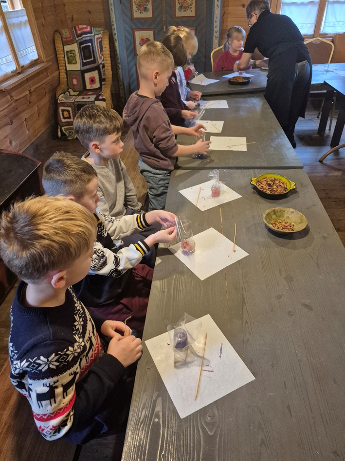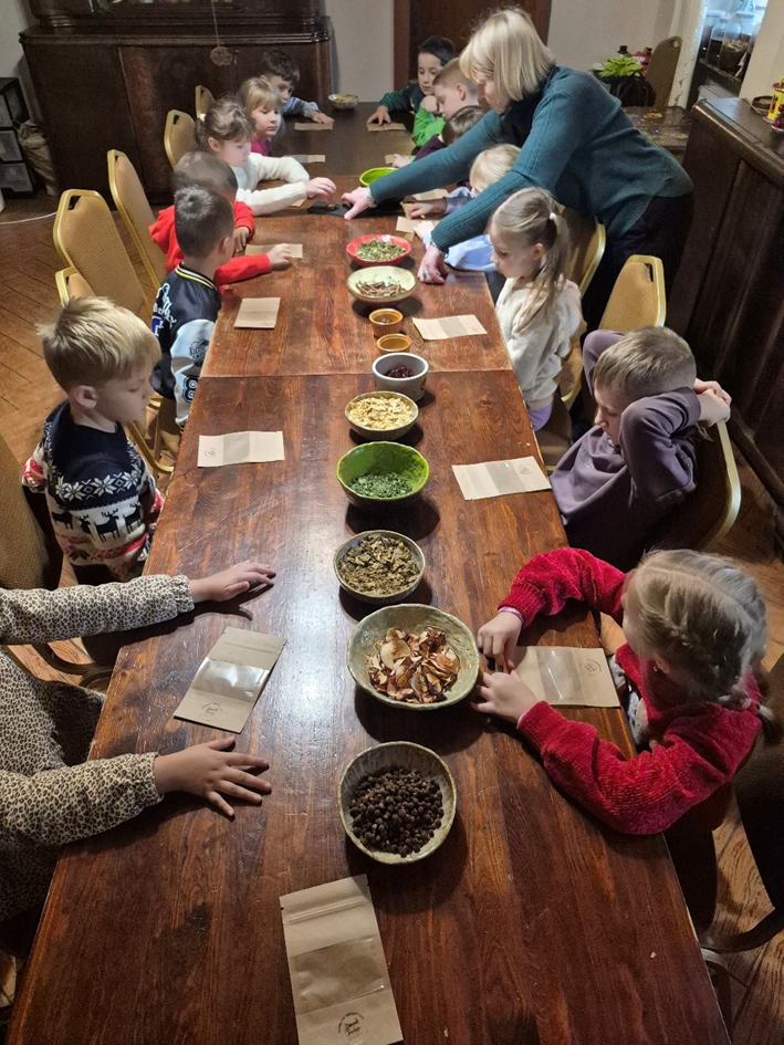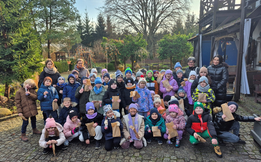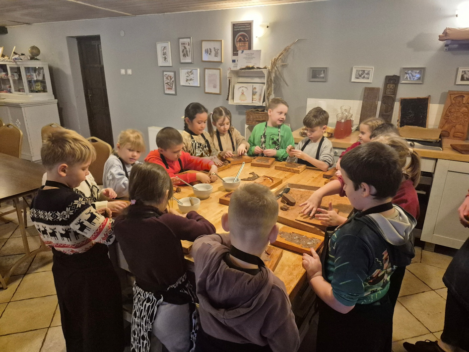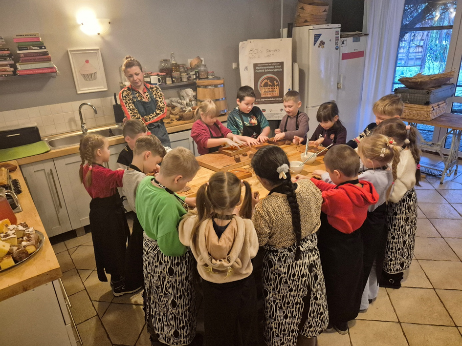 Dnia 18.12.2025 r. w ramach akcji „Wyjście z klasą” uczniowie klas pierwszych odwiedzili Dworek Tradycja w Bełcznej. Pobyt rozpoczął się powitalnym poczęstunkiem domowym ciastem i kompotem. Podczas pobytu uczniowie uczestniczyli w warsztatach i zajęciach edukacyjnych, które pozwoliły im bliżej poznać tradycje kulinarne Pomorza Zachodniego. Dzieci mogły m.in. wspólnie przygotować i upiec szczecińskie pierniki według starej receptury, własnoręcznie tworzyć świąteczne świeczki oraz komponować aromatyczną herbatę. Wiele radości sprawiło im praktyczne działanie, a efekty swojej pracy zabrały do domu jako pamiątki z warsztatów. Cała wycieczka była dla pierwszaków świetną okazją do lepszego poznania siebie nawzajem oraz nauczycieli w nieformalnych warunkach. Uczniowie wrócili bogatsi o nowe doświadczenia, umiejętności praktyczne i wiele pozytywnych wspomnień, a ich uśmiechy świadczyły o tym, że pobyt był zarówno inspirujący, jak i bardzo udany.