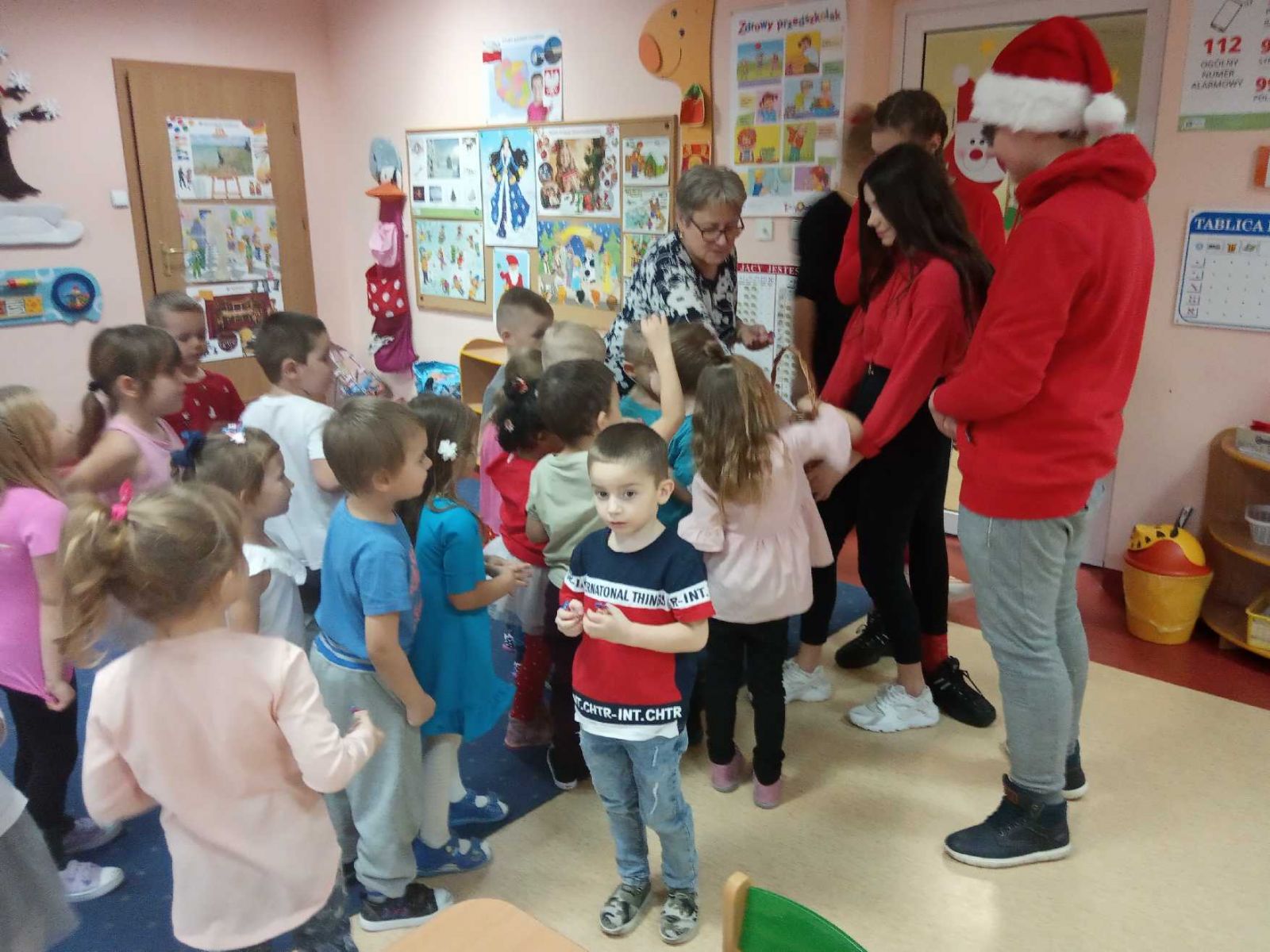 Mikołajki w naszej szkole to czas obdarowywania słodkościami. Każdy uczeń otrzymał dzisiaj z rąk szkolnego Mikołaja cukierki. Jak co roku Samorząd Uczniowski zorganizował i przeprowadził działania. Uczniowie działający w na rzecz uczniów naszej szkoły ubrani w barwy Mikołaja wyruszyli ze słodkim poczęstunkiem do dzieci w przedszkolu i wszystkich szkolnych klas.
